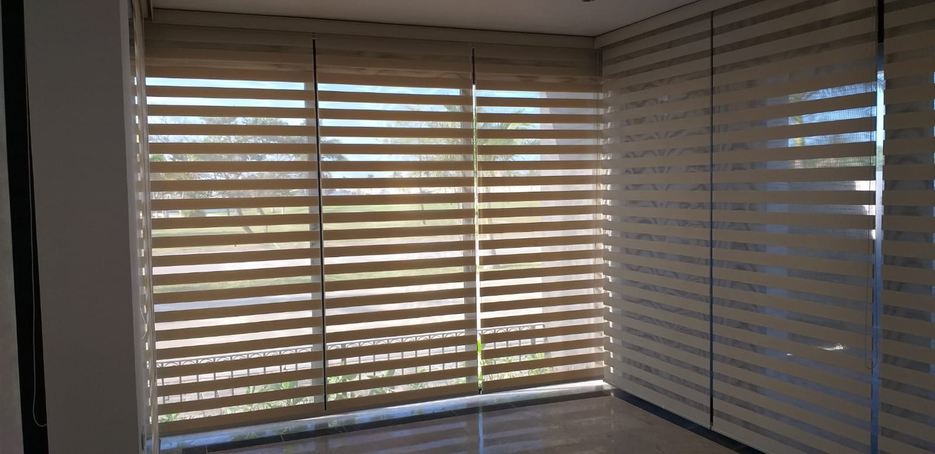 Las telas screen permiten el paso de la luz, visibilidad al exterior y control de la temperatura al interior de la habitación en el día; creando un ambiente amplio y agradable.